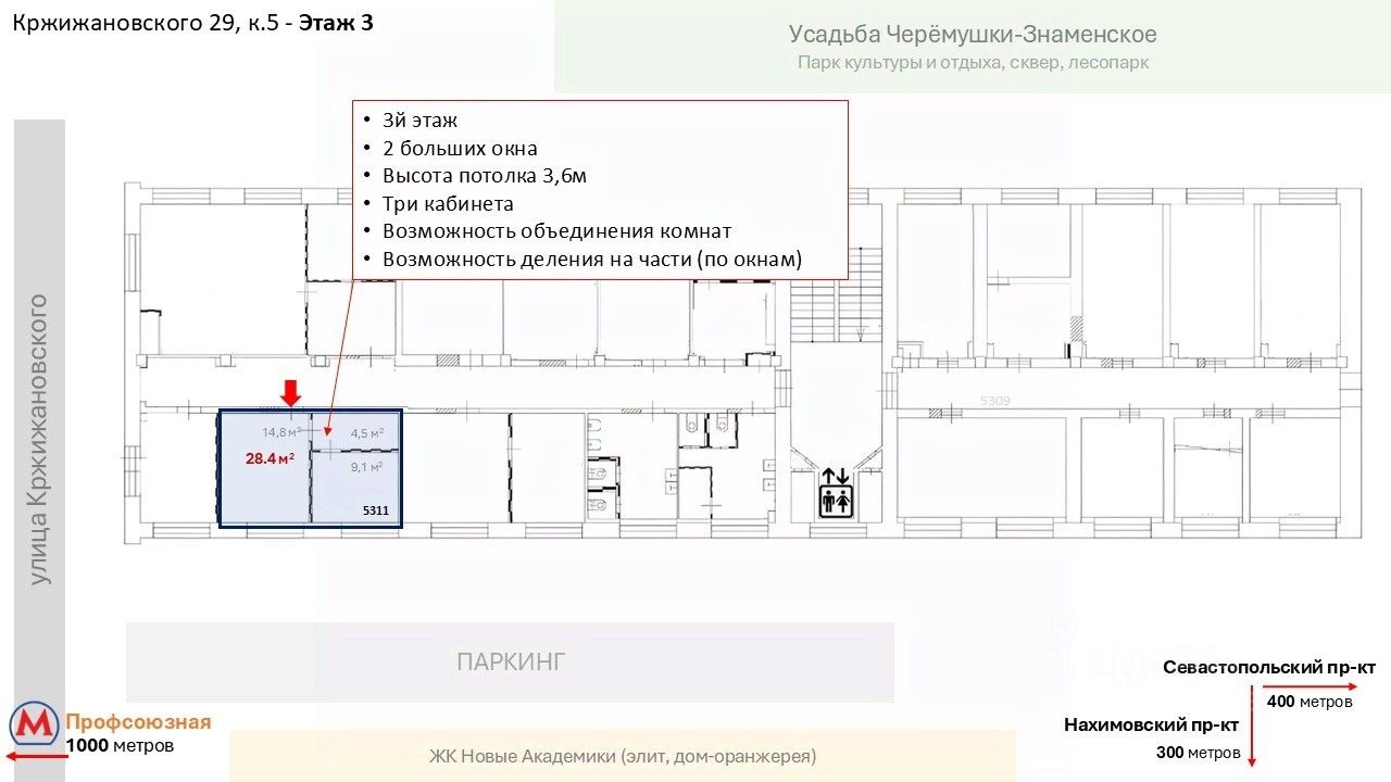 Близость к метро Профсоюзная, Академическая, Калужская - район с высокой деловой активностью.