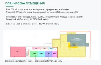 Лот включает в себя часть площади занимаемой арендатором с арендным потоком равным 65% от общей арендной ставки! ( Общая арендная ставка 570 000 рублей в месяц)