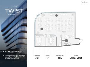 Twist небольшой и уютный. В нём всего 56 офисных лотов и девять этажей. В Twist широкий выбор офисов, которые производят впечатление на клиентов: от 50 кв. м до целых этажей разной площади, включая офисы со своими террасами.