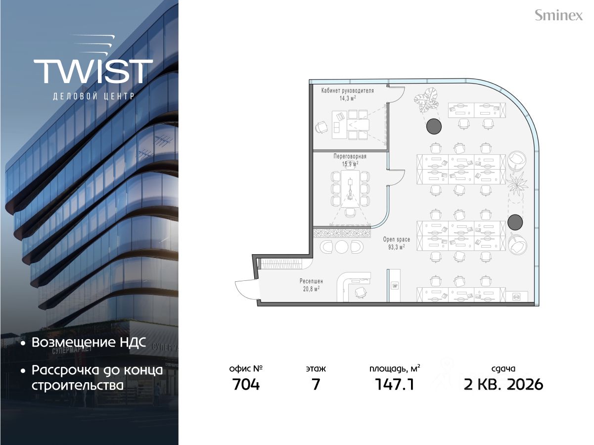 Twist небольшой и уютный. В нём всего 56 офисных лотов и девять этажей. В Twist широкий выбор офисов, которые производят впечатление на клиентов: от 50 кв. м до целых этажей разной площади, включая офисы со своими террасами.