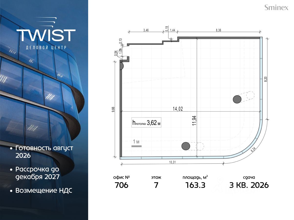 Готовность в августе 2026. Рассрочка до декабря 2027. Видовой офис площадью 163.3 кв. м. в первом клиентском деловом центре с панорамным остеклением на две стороны света: юг и восток. Свободная планировка и минимальное количество несущих конструкций позволяют максимально эффективно зонировать пространство. Панорамное остекление обеспечивает максимальное количество естественного освещения в дневное время и динамичный вид на город в вечернее. Наличие мокрой точки позволяет организовать в офисе кухню или дополнительные санузлы.