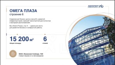 Продажа помещения свободного назначения ОМЕГА ПЛАЗА Современный бизнес-центр класса В с развитой инфраструктурой, хорошей транспортной доступностью и выгодным расположением. БЦ Омега Плаза, стр. 6 - идеальное место для развития бизнеса и комфортной работы. - Панорамное остекление!!!! обилие естественного света - Круглосуточная охрана: видеонаблюдение, контроль доступа - Охраняемый паркинг на 450 машиномест - Современные инженерные коммуникации - Профессиональная управляющая компания - Отдельно стоящее здание - 15 200 м — общая площадь - 6 этажей - 2 входные группы - 5 грузопассажирских лифтов - до 3,5 м потолки ИДЕАЛЬНОЕ РАСПОЛОЖЕНИЕ Бизнес-центр Омега Плаза удобно расположен в активно развивающейся деловой части столицы - Южном административном округе, вблизи крупных транспортных магистралей и в шаговой доступности от станции метро Автозаводская. 200м от метро Автозаводская 500м от Третьего транспортного кольца 4км от Садового кольца Столицы 450 м/мест охраняемый паркинг ОПЕРАТИВНЫЙ ПОКАЗ!! Пишите/ звоните, успевайте забрать свое комфортное, идеальное помещение