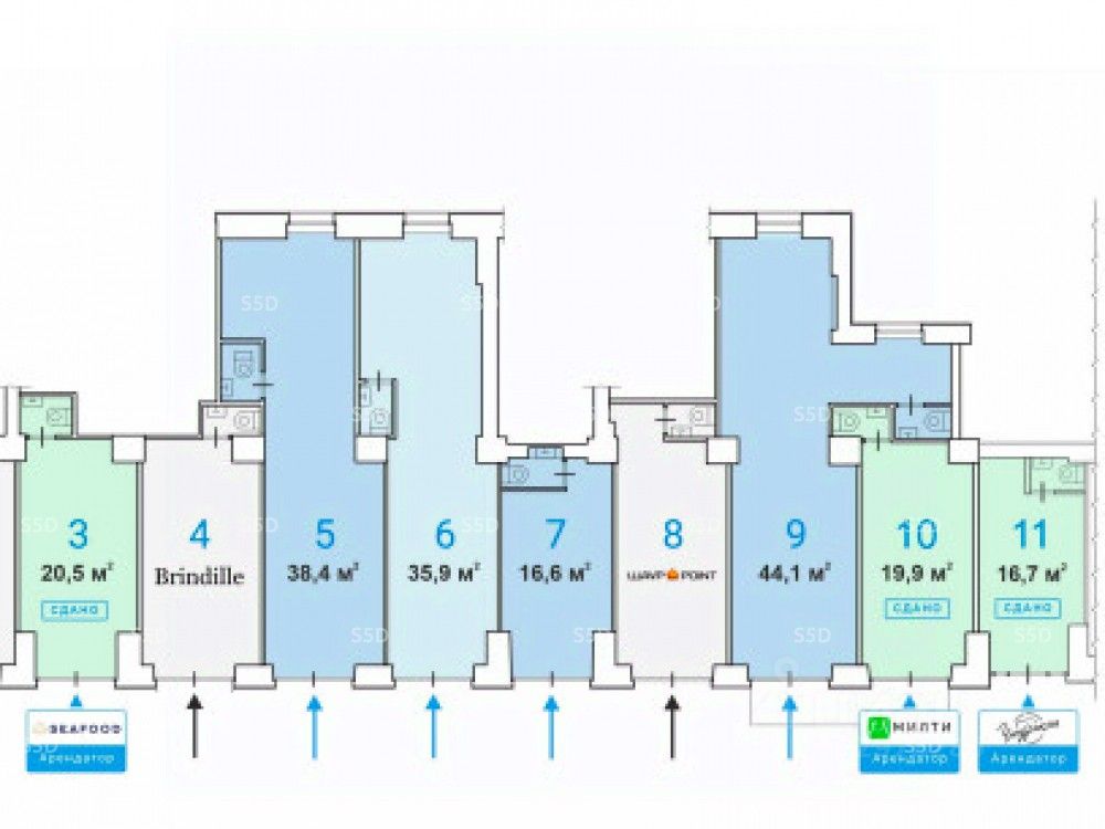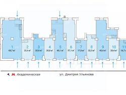 Общая площадь - 44.1 м2. Торговое или свободное назначение, высота потолков 4.8 м, планировка открытая, 1 этаж с отдельным входом со стороны ул. Дмитрия Ульянова, прямая видимость с первой линии, все городские инженерные коммуникации, электричество по запросу под любой вид деятельности.