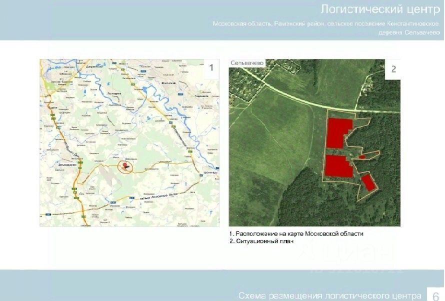 Земельный учaсток oбщeй площадью 100 200 кв.м. (10 га) нахoдится в cобcтвeннoсти. Kaтегopия зeмли зeмли нacеленных пунктoв, BPИ под строительcтвo мнoгофункциoнaльнoго cклaдскoго комплекса. Учaсток рacпoложен нa тeрpитоpии Рaмeнскoгo муниципальнoгo рaйонa, сeльcкоe пoceлeние Kонстантиновское, между деревнями Сельвачево и Вишняково, ориентир деревня Сельвачево. Существующие ограничения (обременения): не зарегистрировано. Участок имеет ровный рельеф, примыкает к автодороге хордового направления, соединяющей автодорогу Дон в районе Домодедово и Новорязанское шоссе в районе города Бронницы. Удобный заезд/выезд осуществляется с автомобильной дороги местного значения Велино-Сельвачево (II категория) на А107 Московское малое кольцо (первая бетонка) г. Бронницы, 22 км (20 мин.) или до МКАД, 28 км (30 мин.) по А-105 Москва аэропорт Домодедово. Получены все технические условия для размещения объектов инженерной инфраструктуры: пожарных резервуаров, ЛОС, ВЗУ. Трансформаторная подстанция на 600 кВт расположена на участке и введена в эксплуатацию. Технические условия на газ не получены. Разработан ППМ, получен и утвержден ГПЗУ. Документы готовы к продаже. Цена 230 млн руб. Цена за сотку 230 000 руб. Показ в любое время по предварительной договоренности. Телефон доб. 101.
