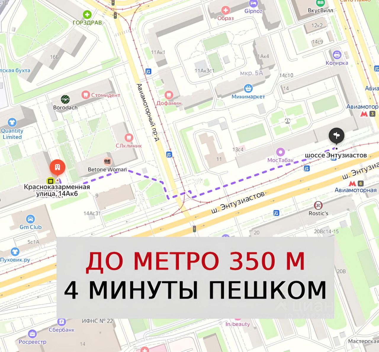 Пешая доступность от станции метро Авиамоторная (4 минуты). Плотный высокоэтажный жилой массив. Сложившееся торговое окружение: Лабквест, Вайлдберрис, Betone, Яндекс маркет и тд.