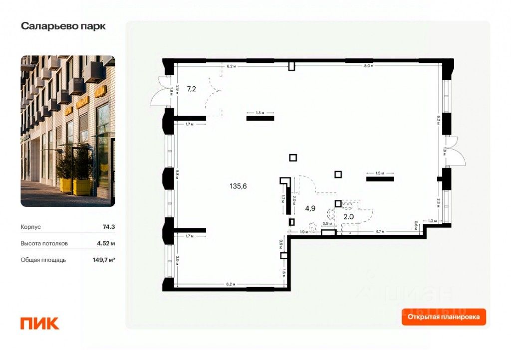 - Открытая планировка, возможно объединить несколько помещений