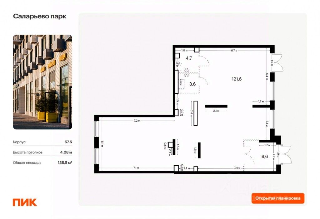 До торговых центров "Саларис" пять минут пешком, до "Рио", Metro Cash and Carry и "Леруа Мерлен" — пять минут на автомобиле. Корпус 57.5. Ввод в эксплуатацию 4 квартал 2027.