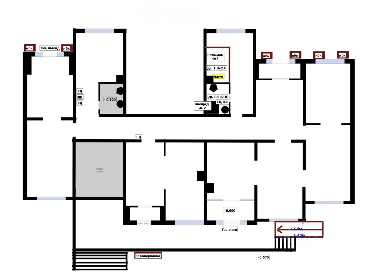 Помещение расположено в многоквартирном 12-этажном доме на 1 этаже. Имеется четыре отдельных входа. Два с улицы и два со двора.