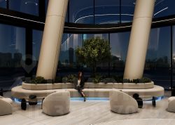 Пространства лобби обладают двусветной структурой, площадью до 500 кв. м, высотой потолков 8 м и витражным остеклением, что обеспечивает высокую степень естественного освещения.