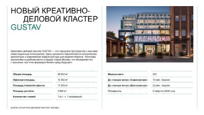 Креативно-деловой кластер GUSTAV — это городское пространство с высоким инвестиционным потенциалом. Здесь органично переплетаются историческая архитектура и современная инфраструктура для ведения бизнеса. Технопарк расположен в удобном месте в сердце старой Москвы, что объединяет его с прошлым, при этом формируя бизнес-среду будущего. Готовность осенью 2026 года. Доступна рассрочка 0% на 11 месяцев при ПВ 50%. Выгода до 10% при 100% оплате! • Общая площадь креативного кластера 59 922 м² • Офисная площадь 10 292 м² • Площадь industrial-офисов 17 293 м² • Количество этажей 7 этажей • Паркинг на 221 машино-места • Готовность: 3 квартал 2026 • Шаговая доступность от метро Савеловская (10 минут пешком) и метро Дмитровская (12 минут пешком) Главные преимущества GUSTAV: - Место с историей Основанный в 1887 году завод "Борец" стал символом индустриального наследия, а теперь перерождается в современный креативный кластер. - Принципиально новый формат коммерческой недвижимости Концепция industrial-офисов берет лучшее от форматов light industrial и open space. Такой тип помещений позволяет не ограничивать функциональность и гибкость бизнеса, при этом компания может развивать операционную деятельность в ритме с городом. - Высокотехнологичное оснащение Современные системы безопасности и передовые технологии позволяют работать эффективно и обеспечивают максимально комфортное пребывание в офисе в течение всего дня. - Удобная локация GUSTAV расположен в центре креативного треугольника Москвы — рядом с метро и ТТК, что делает логистику для бизнеса простой и удобной.