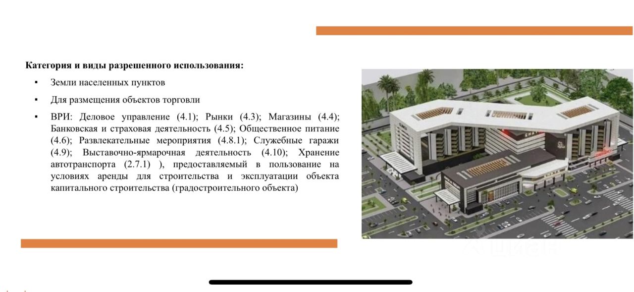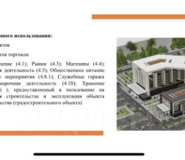 ВРИ: Деловое управление (4.1); Рынки (4.3); Магазины (4.4); Банковская и страховая деятельность (4.5); Общественное питание (4.6); Развлекательные мероприятия (4.8.1); Служебные гаражи (4.9); Выставочно-ярмарочная деятельность (4.10); Хранение автотранспорта (2.7.1) ), предоставляемый в пользование на условиях аренды для строительства и эксплуатации объекта капитального строительства (градостроительного объекта)