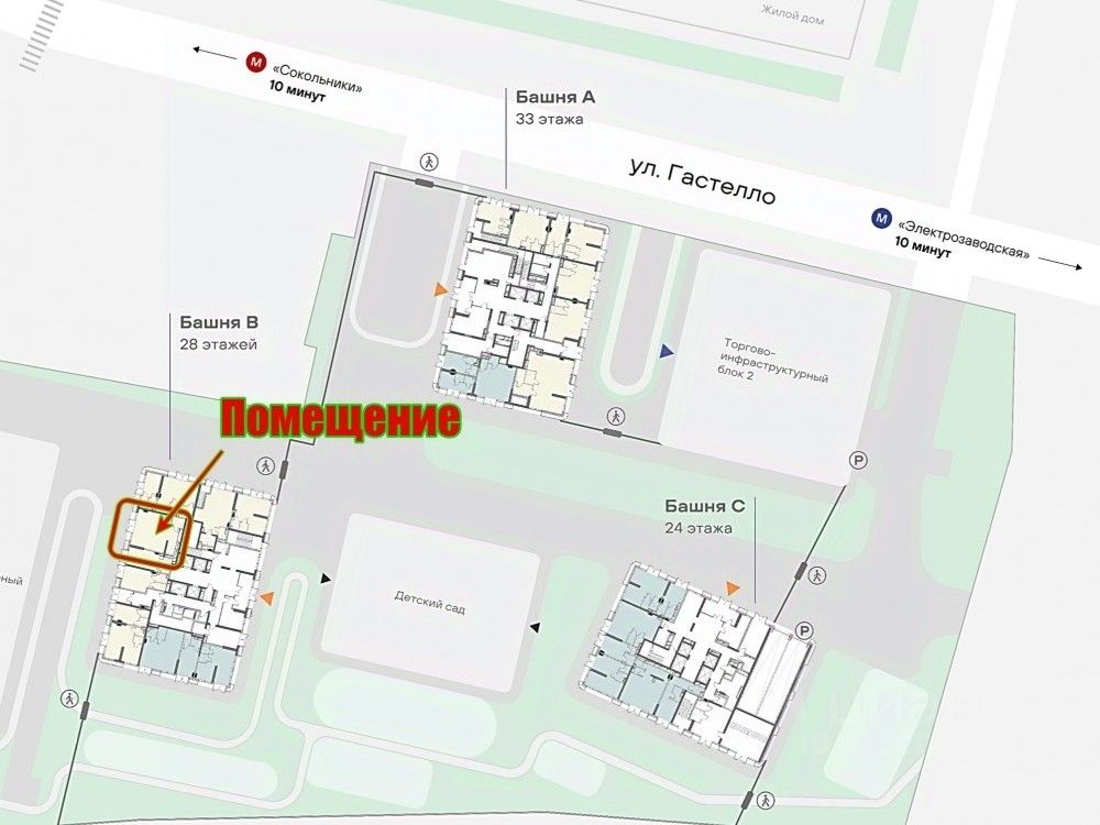 Продажа помещения свободного назначения в новом ЖК бизнес-класса SOKOLNIKI, по адресу: ВАО, Москва, ул. Гастелло, 30, площадью 51,9 кв.м. В пешей доступности находятся две станции метро — "Сокольники" и "Электрозаводская". Удобный выезд на ТТК, шоссе Энтузиастов и Садовое кольцо.