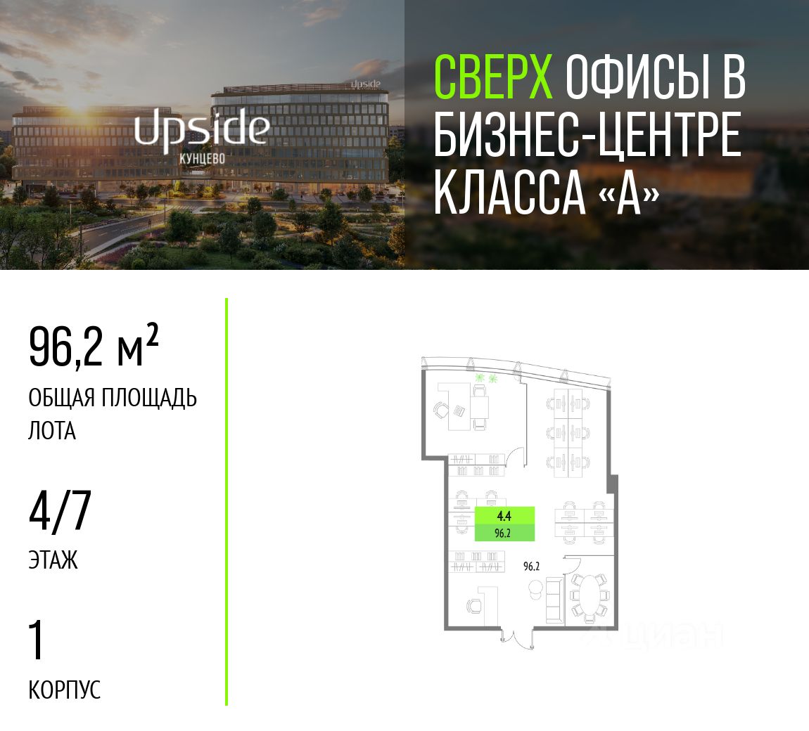 В продаже офисное помещение в строящемся бизнес-центре класса "А" Upside Кунцево. Срок ввода в эксплуатацию — IV квартал 2025 года. Рассрочка 0% от застройщика до ввода объекта в эксплуатацию, с ПВ от 50% Эко-архитектура современной урбанистики и свой природный парк Бизнес-центр состоит из двух корпусов, вписанных в природный ландшафт. Такой эффект достигается благодаря концептуальным решениям: имитации растительных форм и интеграции природных элементов в объект. Стилистика интерьера вдохновлена органической архитектурой. Образ пространства дополнят объекты современного искусства. Впечатляющая транспортная доступность Бизнес-центр Upside Кунцево находится в престижном районе на западе Москвы, в 50 метрах от трёх станций метро "Кунцевская", новой платформы БКЛ и одноимённой станции МЦД-1. Время в пути: • до съезда на Рублёвское шоссе — 1 минута, • до Кутузовского проспекта — 5 минут, • до Москва-Сити и Нового Арбата — 15 минут. Инфраструктура для продуктивной работы Внутренняя инфраструктура разнообразна и насыщена, что позволит создать комфортную среду для резидентов. Для работы предусмотрены: • переговорные комнаты, • коворкинги, • конференц-зал, • мультиформатные деловые пространства, • двухуровневый подземный паркинг. Сотрудники и гости БЦ смогут воспользоваться кафетерием с выходом на открытую террасу, где можно дистанционно заказать блюда. На первом этаже расположится коммерческая инфраструктура: продуктовый ритейл, кафе и рестораны, кулинария, аптека, салон красоты, постаматы. Высокотехнологичный бизнес-центр с современными инженерными решениями Бизнес-центр Upside Кунцево получил сертификат GREEN ZOOM за соответствие экологическим требованиям и энергосбережение. В здании используются энергоэффективное оборудование и материалы, а также системы рекуперации тепла. В бизнес-центре круглый год поддерживается комфортный микроклимат благодаря автоматизированной системе управления, приточно-вытяжной вентиляции и центральному кондиционированию. Системы безопасности и комфорта включают: • видеонаблюдение, • FACE ID, • распознавание госномеров для доступа в паркинг, • скоростные бесшумные лифты с интеллектуальным управлением, • бесплатный Wi-Fi. Девелопер проекта Upside Development.