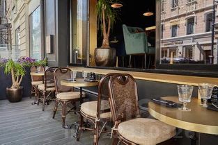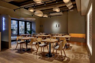 Центральный вход с фасада здания, панорамное остекление, зона разгрузки со двора, летняя терраса для ресторана перед фасадом здания.