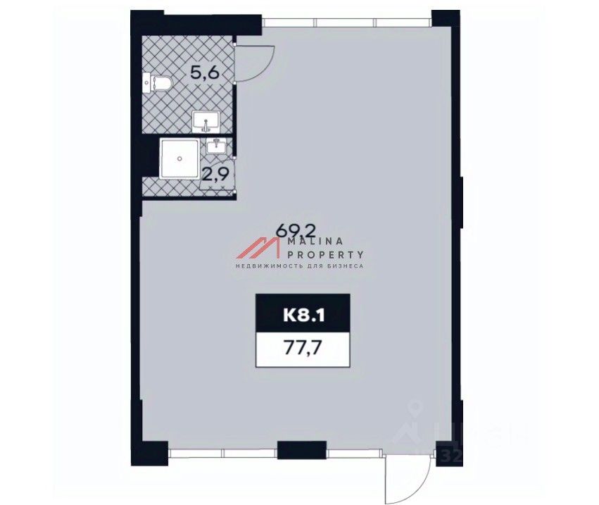 Помещение 77,7 м2, располагается на 1 этаже, открытая планировка, один вход, высота потолка 5,72-6,12 м, витринные окна по фасаду. Электрическая мощность 0,1 Вт на м2.