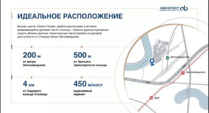 Бизнес-центр Омега Плаза удобно расположен в активно развивающейся деловой части столицы - Южном административном округе, вблизи крупных транспортных магистралей и в шаговой доступности от станции метро Автозаводская.