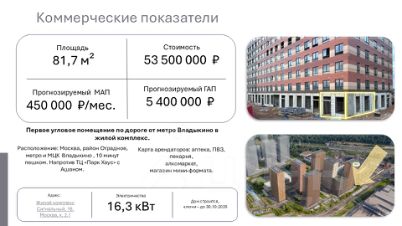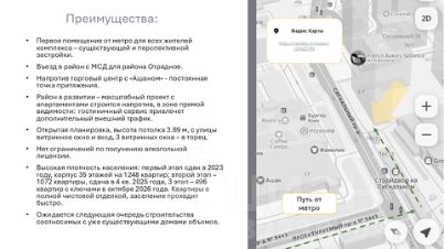 •Район в развитии масштабный проект с апартаментами строится напротив, в зоне прямой видимости: гостиничный сервис привлечет дополнительный внешний трафик.