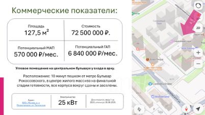 10 минут пешком от метро Бульвар Рокоссовского, в центре жилого массива на финальной стадии готовности, все корпуса вокруг сданы и заселены.