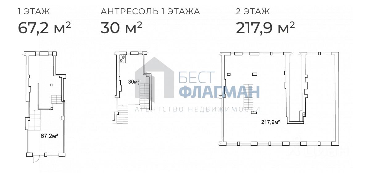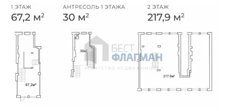 1 этаж: 67, 2 м², Антресоль: 30 м², 2 этаж: 217, 9 м²