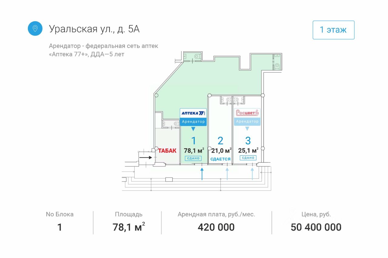 К продаже предлагается торговое помещение площадью 78.1м² по адресу: Москва, улица Уральская ул. д.5А