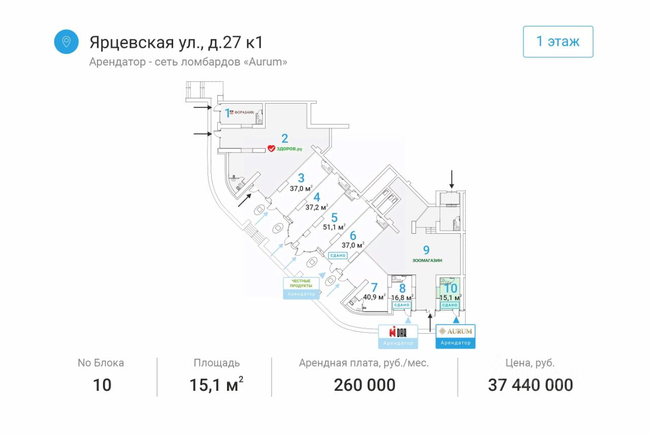 В продажу предлагается торговое помещение площадью 15.1м² по адресу: Москва, улица Ярцевская ул. д.27 корп.1