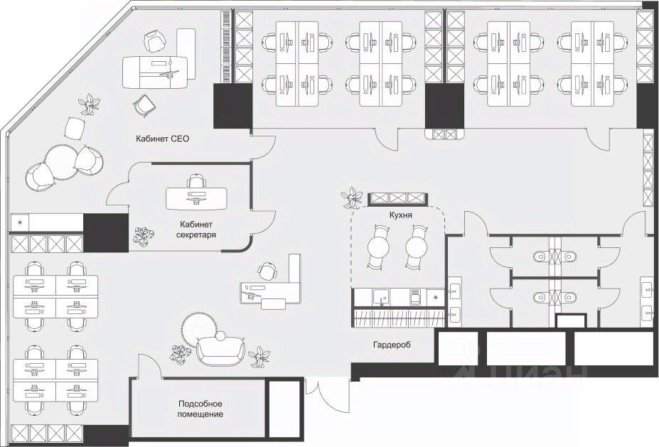 Офис под чистовую отделку, внутри открытая планировка, одна мокрая точка, тип окон - витринные, окна выходят во двор, общая площадь здания 134839.4 м, год постройки 2028 г.
