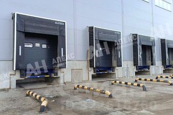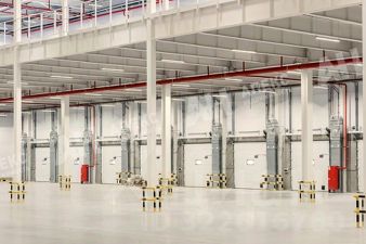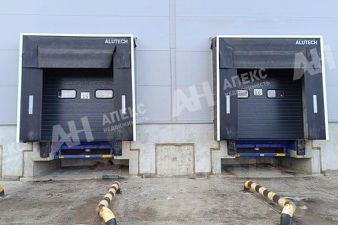 38 доковых ворот, расстояние между доками 6м, докшелтеры с регулируемой гидравлической платформой, тентовые герметизаторы ворот, колесные направляющие, приямок под уравнительную площадку.