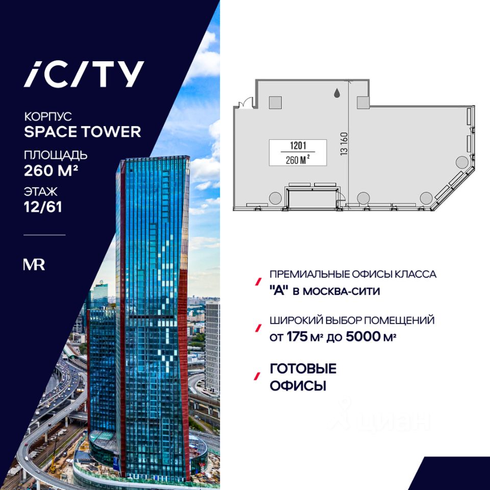 Предлагается офисное помещение, с рассрочкой 0%, площадью 261.50 м² на 12 этаже в башне "Space Tower" деловых небоскребов класса "А" iCITY. Расположен в Москва-Сити. Проектом предусмотрена уникальная система проветривания помещений. Свободная планировка. Отделка Shell and Core. Высокие потолки 3,75 м и панорамное остекление обеспечивают отличную инсоляцию.