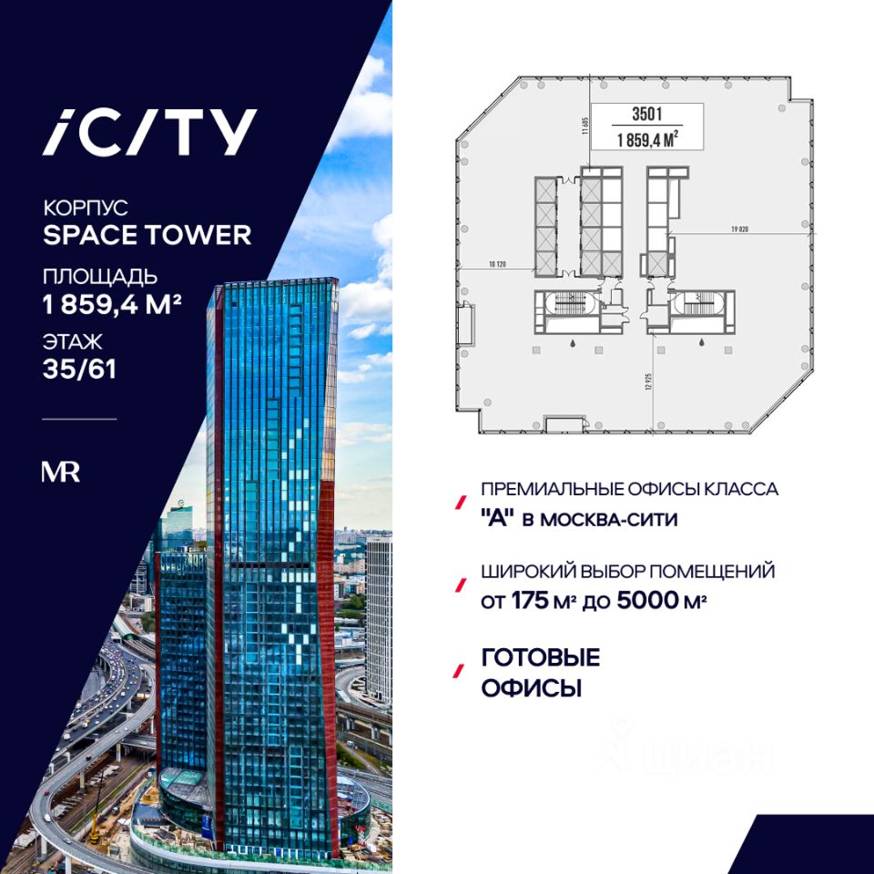 Предлагается офисное помещение, с рассрочкой 0%, площадью 1865.70 м² на 35 этаже в башне "Space Tower" деловых небоскребов класса "А" iCITY. Расположен в Москва-Сити. Проектом предусмотрена уникальная система проветривания помещений. Свободная планировка. Отделка Shell and Core. Высокие потолки 3,75 м и панорамное остекление обеспечивают отличную инсоляцию.