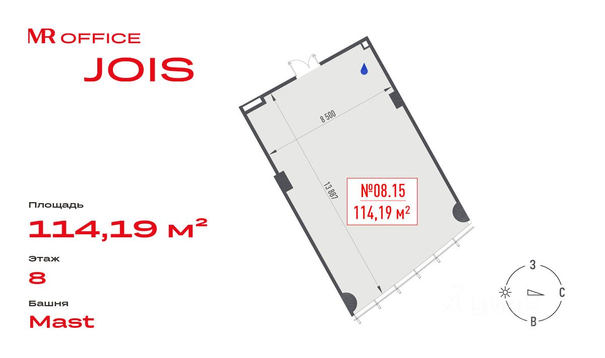 Предлагается офисное помещение 114.19 м² на 8 этаже БЦ Jois.
