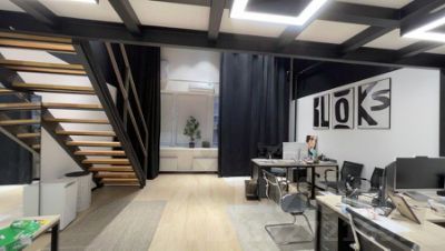 Помещение расположено на втором этаже, с большими окнами и высоким потолком — 4,5 метра.