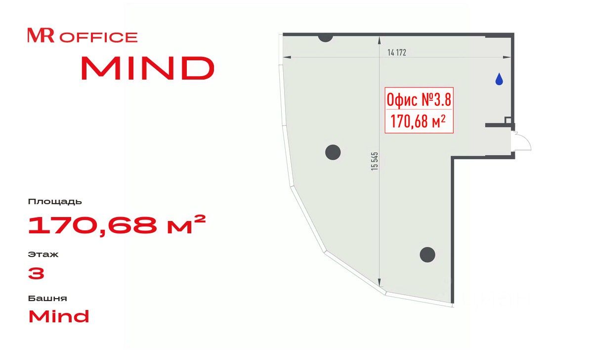 Продаётся офисное помещение 170.68 м² на 3 этаже в новом бизнес-центре MIND — проекте класса А от девелопера MR. Здание расположено на первой линии Ленинградского проспекта, всего в 6 минутах пешком от метро "Динамо" и в 10 минутах от Третьего транспортного кольца.