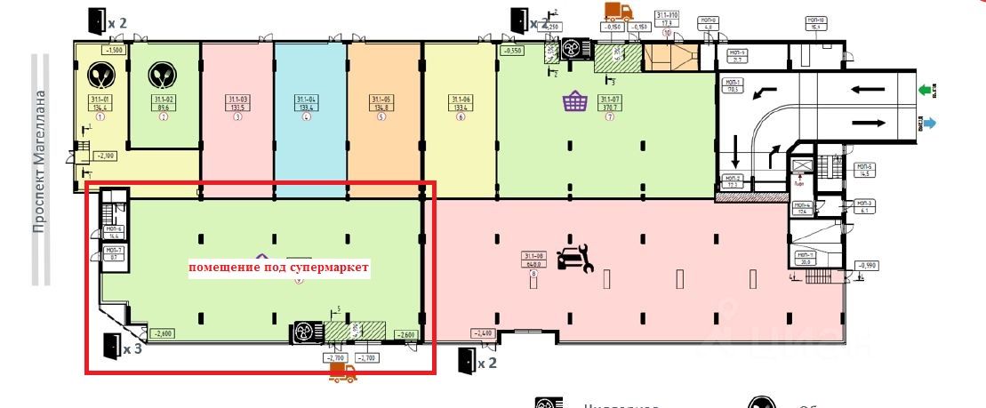 В помещении 3 отдельные входные группы, есть зона разгрузки. Высота потолков 5.04 м. Электрическая мощность 147 кВт. Витринное остекление. Короба вентиляции 600х300, 600х300, 400х200, диаметр 125. Нагрузка на пол 800 кг/м².