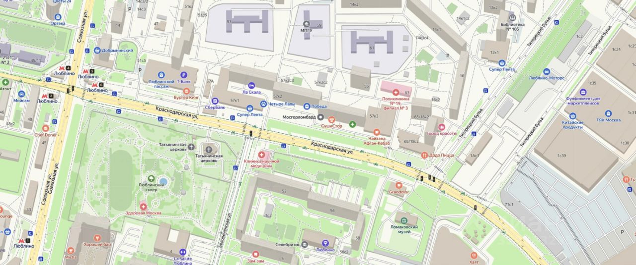 Объект расположен в густонаселённом спальном районе в непосредственной близости от станции метро Люблино, сверхинтенсивный пешеходный трафик вдоль помещения и отличная видимость с Краснодарской улицы, сложившееся торговое окружение. Первая фасадная линия домов, первый этаж (без подвала). Отдельный вход с фасада, центральные коммуникации. Зальная планировка, высота потолков 3,8 м, панорамные витрины. Рядом с помещением расположен городской паркинг, остановки общественного транспорта. Неподалеку знаменитый торгово-ярмарочный комплекс Москва.