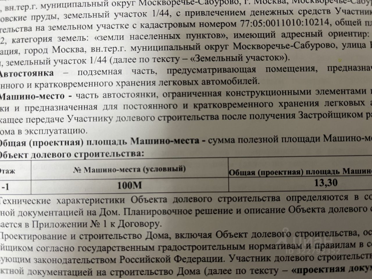 Продам машиноместо по договору переуступки прав в подземном паркинге под домом в строящемся ЖК Вейв по адресу Москва, Москворечье-Сабурово, Борисовские пруды, земельный участок 1/44 (2 этап) машиноместо номер 100М, этаж -1, площадью 13,3 кв.м. Оформлен договор участия в долевом строительстве с застройщиком. Окончание строительства по договору не позднее 30.07.2027г. Есть выписка из ЕГРН.Застройщик ЛСР.