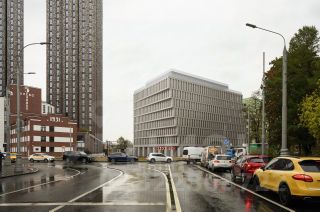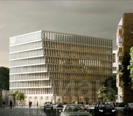 Девятиэтажное офисное здание аккуратно интегрировано в сформированную среду.