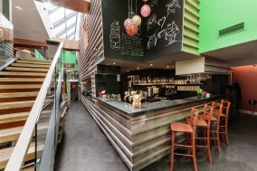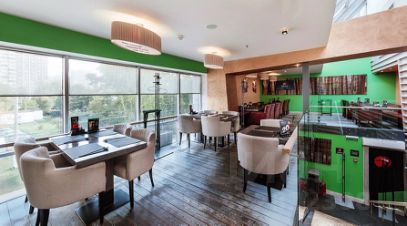 2-х уровневое фасадное панорамное остекление зала, прекрасно оборудованная входная группа с атриумом.