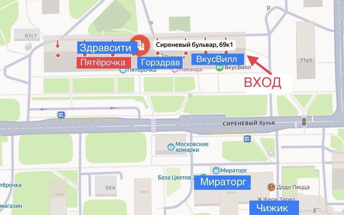 Соседи в этом же доме- сетевики ВкусВилл, Пятерочка, Горздрав, ЗдравСити и пр. Центр торговой жизни района. Напротив - Мираторг и Чижик. Люди ходят мимо помещения постоянно в объекты торговли.
