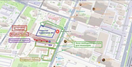 Объект имеет 3 входные группы, объединяющие 1-й и 2-й этажи. 1-я входная группа располагается рядом со входом на закрытую территорию ЖК, рядом с въездом на подземную парковку и напротив наземной парковки. Она включает в себя вход в супермаркет "Пятёрочка, вход в прикассовое помещение и на 2-й этаж. Остальные 2 входные группы находятся в 40 и 70 м от входа в супермаркет "Пятёрочка", располагаются напротив наземной парковки (последний вход расположен рядом с детской площадкой).