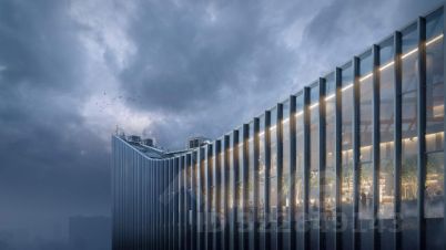 Выразительная архитектура: Уникальный проект от бюро UNK architects. Здание с панорамным остеклением и алюминиевыми ламелями напоминает роскошную яхту, символизируя успех и динамику. Фасадная подсветка создает эффектный облик в вечернее время.