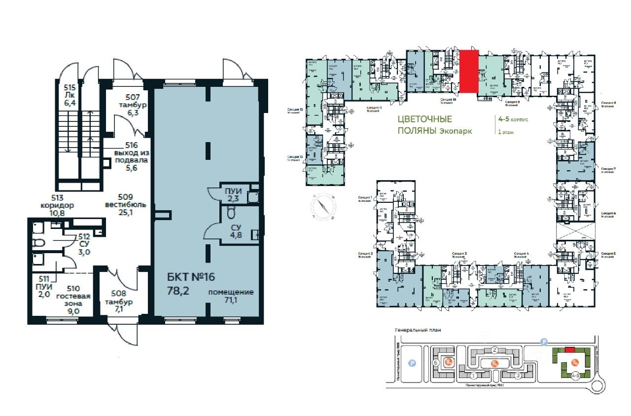 В продаже просторное коммерческое помещение площадью 78,2 м² в корпусе 45 современного жилого комплекса комфорт-класса Цветочные Поляны ЭкоПарк.