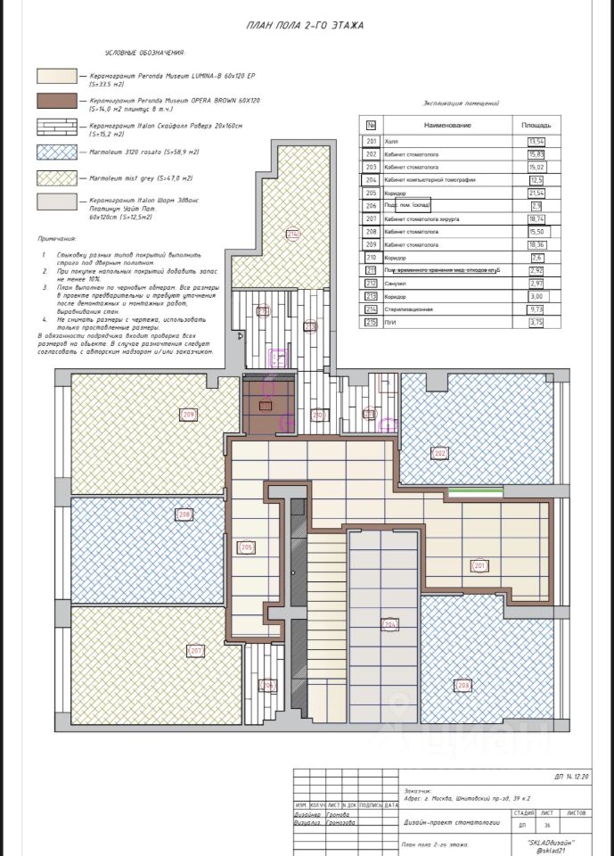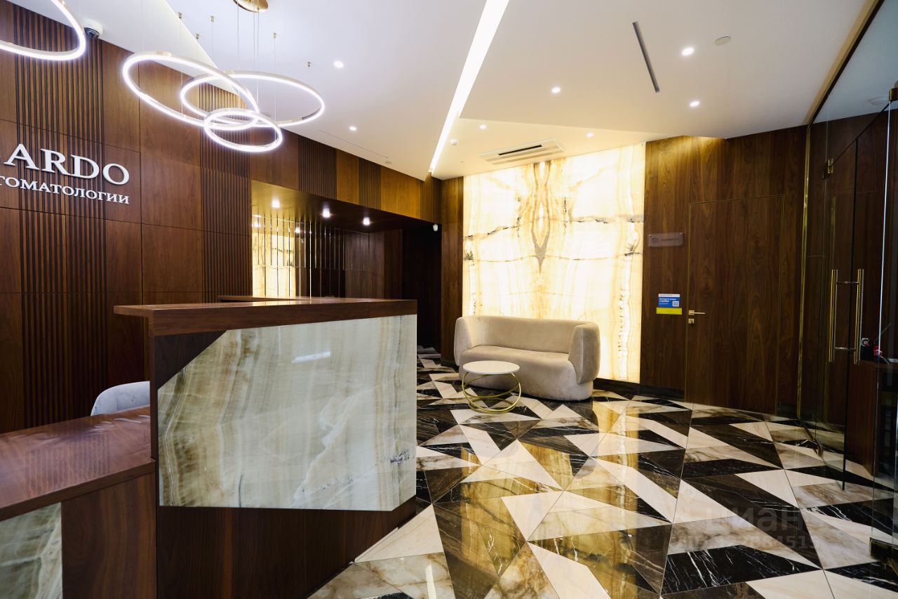 Помещение располагается на двух уровнях. Планировка первого уровня включает ресепшен в просторном вестибюле, гардеробную, комфортную зону отдыха для клиентов, кабинет, переговорную комнату, технические и вспомогательные помещения, объединённые коридором. Все проемы оформлены цельностеклянными конструкциями и дверями из закаленного стекла толщиной 8 и 10 мм с эксклюзивной фурнитурой цвета нитрид титана. На полу и стенах испанский керамогранит премиальных коллекций. Монументальное панно из натурального слэба Оникса толщиной 20 мм. с интегрированной подсветкой. Мебель из массива дерева по индивидуальному проекту, дизайнерские светильники и бра в сочетании с продуманным точечным освещением каждого помещения. Монолитная лестница с изящным стеклянным ограждением и поручнем из нержавеющей стали. На втором уровне второй ресепшен, просторный холл, рабочие кабинеты, подсобные помещения, рентген-кабинет. Два санузала на обоих этажах с качественной сантехникой.