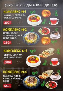 - Дополнительные блюда (салаты, плов, шурпа, люля-кебаб, пироги, выпечка, кофе и др.)