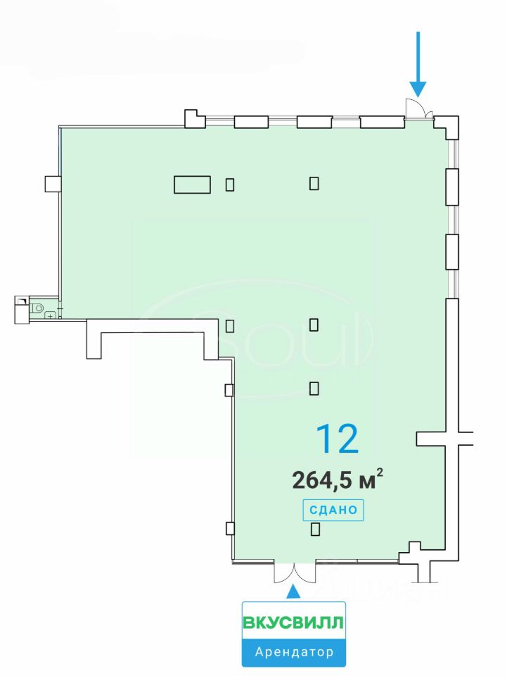 Помещение площадью 264,5 кв. м находится на первом этаже жилого дома (встроенно-пристроенный формат). Планировка открытая, высота потолков составляет 4,7 м, перекрытия — железобетонные. Пространство легко адаптируется под любые задачи: магазин, ресторан, кафе, аптеку, салон красоты, банк, офис продаж, кофейню и другие направления.