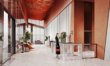 Гостей и сотрудников бизнес-центра встречает яркое лобби с девятиметровыми потолками и витражным остеклением. Также на первом этаже располагается ритейл с магазинами, аптекой и кафе.