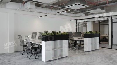 Отделка офисов выполнена в едином стиле из качественных материалов. В офисах лежит серый ковролин. Двери из каленного стекла. Перегородки толщиной 150 мм с двухслойной шумоизоляцией. Приточно-вытяжная вентиляция. Панорамное остекление. высокие потолки 3.6 м.