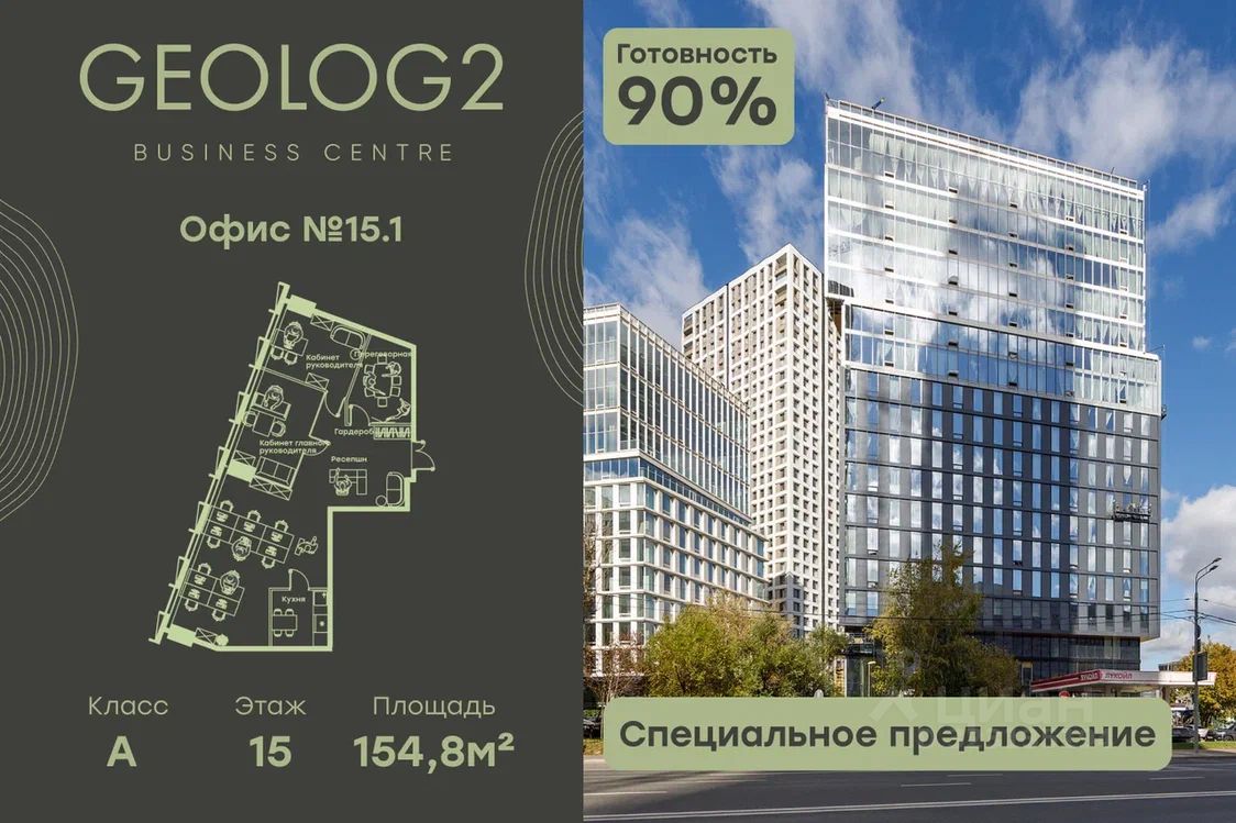 Продается офис в новом, концептуальном Бизнес-центре GEOLOG2. Бизнес-центр представляет собой отдельное офисное здание класса А: с просторным двухсветным лобби с панорамными окнами, бизнес-гостиной и подземной парковкой для резидентов. Расположен на Юго-Западе г. Москвы, в 7-ми минутах пешком от м. Калужская. Архитектурная концепция здания разработана Архитектурным бюро Blank Architects. В основу идеи заключен принцип тектонических сдвигов: смещения частей здания относительно друг друга, в результате чего архитектурный облик здания визуально разделяется на две, разные по объему и площади остекления, части.