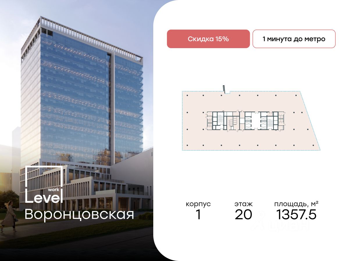 Продаётся помещение площадью 1357.50 кв. м в Level work Воронцовская (от компании Level Group), новом бизнес-центре класса A в престижном Обручевском районе Москвы (ЮЗАО).
