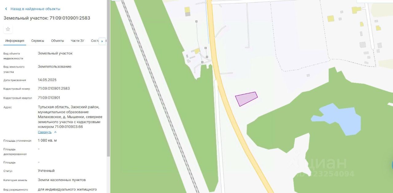 продажа земельного участка из земель населенных пунктов с кадастровым номером 71:09:010901:2583, площадью 1080 кв. м, адрес: Тульская область, Заокский район, МО Малаховское, д. Мышенки, севернее земельного участка с кадастровым номером 71:09:010903:66, вид разрешенного использования: для индивидуального жилищного строительства.