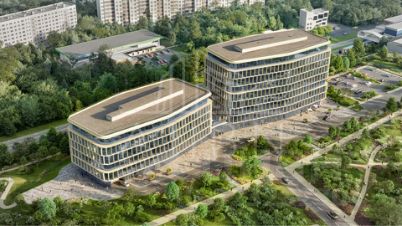 Бизнес-центр состоит из двух корпусов, вписанных в природный ландшафт.